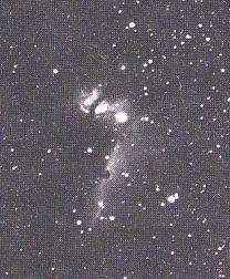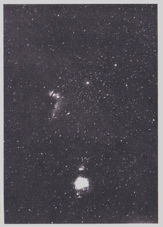 | 左の写真は何かわかるかなぁ? 有名なオリオン座の中央部。某天文雑誌に入選した作。 真ん中上に星が3つ右上に向けてならんでるでしょう。これがオリオンの三ツ星、下の方にボーとした大きな光の固まりを中心とした並びは子三ツ星。中心はM42星雲、今でも☆が活発に生まれている所。撮影1982/12/18、22:32〜23:02 アサヒペンタックスME、f=100mm。水素増感TP2415+R64フィルター。D−19処理。フジブロWPFM4。 モノクロフィルムを真空処理、さらに水素ガスを吸着させて感度を極限まで上げる。これを冷凍保存し、必要なときに解凍して使う。水銀灯の光を避けるためフィルターをかけてほとんど赤外線領域で撮影する。現像処理はガチガチの硬質仕上げ。当時の最先端技術。特殊処理なのですべて自分でやるしかなかったけど今はどうしてるのかなぁ。CCDだから必要ないか。 この小さな写真は、三ツ星の一番左側付近を拡大した所。暗黒星雲が明るい星を隠しているのがよく分かるでしょう。暗黒星雲の先っほの部分は馬頭星雲と呼ばれている。ここも星が生まれているところだ。少しは星に興味を持ってもらえました? おいどんは、New Zealandで大マゼラン雲、南十字星を見ておきながら写真とれなかったが心残り。 |