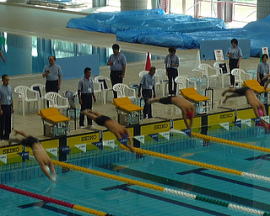 | 【大会第1日目】会場は立派。水泳、テニス、サッカー場、レストラン・・一大総合運動公園でした。公園中にスポマスの旗が立ててあって、すごく良い気分。うれしかったですね。実業団の京都会場は何もなかったからね。やっぱり旗が立ててあると気分が盛り上がって良いよ。 スタート台はブロックの付いた最新式のもの。とりあえず2本飛んで感触を確かめておきましtあ。おいどんは昨年からクラウチングに変えたので、特に違和感はなく、いい感じで飛ぶことができました。角度は10度。結構急なので、上がるときに滑らないようにしなくちゃ。スタート台から落ちたらカッコ悪いし。結構みんな使いこなしていて、戸惑っている雰囲気もなありませんでした。 今日おいどんは個人の100mとFリレーに出場です。順位は希望では3位、まあ4位が順当なところかな。最近の体調や気持ちから考えると5位、6位もありえるって感じでした。アップの感触もなんとも言えないって感じ。可もなく不可もなく。ごくごく普通って感じでした。 本当はもっと悪くて、最悪かと思っていたので、普通である事が救い。もしかしたらそれなりの泳ぎが出来そうな期待もありました。 で、いよいよ100mレースのスタート。メンバーは大体顔見知り。「この人が一番」「2番はこの人・・」って泳ぐ前から順位が解かってしまう。おいどんはノーマークで端っこのコース。でも、どうせ同じようなタイムだから、頑張りようによっては上位も十分可能性あるよなっと、1人勝手にライバル気分になっておく。 スタート。うん、まあ飛び込みは決まったよ。腹打ちやゴーグルのずれもなく、深さもほどほど。今回は体力に自信がなかったので、とにかく大きく伸びのある泳ぎを心がける。先行されても大差がなければ追いかけない。ほどほどの位置でついて行く。体力を考えた無理の無い泳ぎを心がけて前半の折り返し。とりあえず横のコースは抜いたみたいだ。中ほどの順位にいる様子。 いつもならターンの後、徐徐にスピードを上げていくのだけど、今年は全く自信がないので75mまでじっと我慢をする。行きたいところを抑えて、まだ、まだと言い聞かせながら力を残しておく。 で、ラスト25m。パワー全開。アクセル踏みっぱなしって感じで前へ、前へ、と泳ぐ。フォームが小さくならない様に、犬掻きにならないようにとだけ考えて泳ぐ。 意外に持つんだ。バテてしまうかと思っていたら、90m過ぎてもまだきちっとしたフォームがキープできてる。 ラスト5m。焦るな、焦るな、フォームを崩したらいかん。腕で引っ張っていけ、キックで押して行け! そう、おいどんは足が痛くて病院に通っていました。この大会も痛みが気になって全力出せないかも。後で痛みがひどくなるかも知れないって不安を抱えての出場でした。 アップでしっかり膝を暖めておいたのが良かったのか、不思議と最後まで痛みは感じず、レースに集中する事ができ、掲示板を見ると・・何と3位って出てるじゃないですか。 えっ、えっ、えっ、え〜っ 3位ってあの3位?表彰台に上がって、「ひょう しょう じょう」って賞状をもらえるあの3位・・しつこい! おいどん初めてだよ。表彰台にあがったの。 全国の舞台で表彰台に上がるのがずっと夢だった。日本の舞台で表彰台にあがるのが夢だった。 昨年の国際ゴールドマスターズは世界の舞台で2位だったんだけど、世界大会って言っても日本人ばっかりだし、地元の人が殆ど。超ローカルな国際大会だったから、世界2位と言う言葉はおいどんの宣伝には使わせてもらっているけど、いつかまやかしでなくきちんとした皆が目標にする大会で表彰台に上りたいって思っていた。 鈴木大地さんから握手してもらって賞状をもらいました。感激で、思わず顔がほころびる。うれしさが隠し切れないので、返って無理に平常を保とうとむっつりした愛想のない顔になる。控え場所に帰るとみんなが「おめでとう」「すごいなぁ」と行ってくれて本当に嬉しかった。最大の目標を達成したってそんな満足感を感じました。 ついで200mリレー。おいどんは第一泳者。専門外のフリーだが仕方ない。なんせアンカー意外は員数あわせで出ているのだから。この所クロールは調子よくて、水を押さえ込む、乗り越える感じが出るようになってる。伸びのある大きな泳ぎで良い記録が出るんじゃないかとひそかに期待しておく。しかも第一泳者だから正式計時だし。 で、用意どん!。スタートでお腹を打った。へたくそだなあ。すぐに横の選手が先に行くのが見える。圧倒的なスピードの差。 おいどんだって自由形は自信つけたんだから、そう簡単に負けへんで。と振るパワーで腕をぶんぶん回す。そう振り回す。 やだねえ、冷静さを失って、水を押さえ込む、乗り越える感覚なんか何処に行ってしまったやら。ただひたすら腕をぶんぶん振り回すのみ。当然の結果として40m以降は腕が動かず、ぽっかり浮いたまま。枕してしまいました。スタート台の